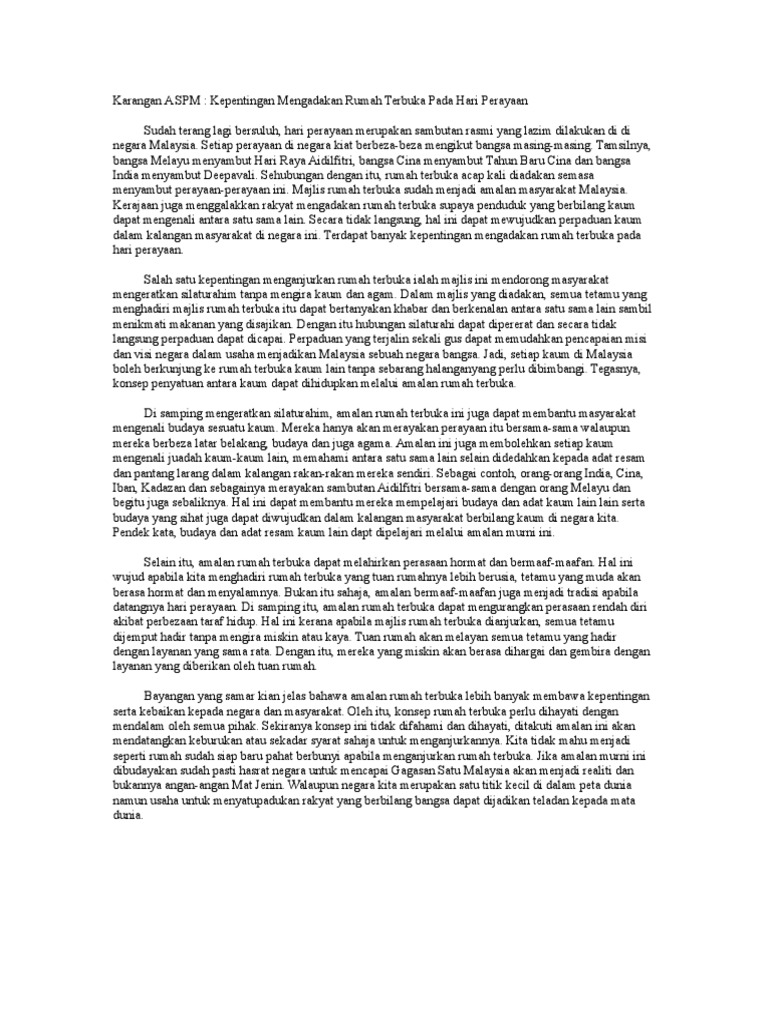 Kegiatan kokurikulum di sekolah seperti unit beruniform, sukan dan olahraga, permainan serta kelab dan persatuan mampu memperkembangkan potensi seseorang murid. Memang tidak dapat dinafikan bahawa amalan menabung amat penting dalam kehidupan manusia. • bukan itu sahaja, amalan berjimat turut menjamin masa depan yang lebih cerah. Karangan kepentingan rumah terbuka rakyat malaysia. Sesungguhnya, proses pembudayaan yang wujud dalam konsep rumah terbuka menyaksikan pertembungan antara dua atau lebih budaya.